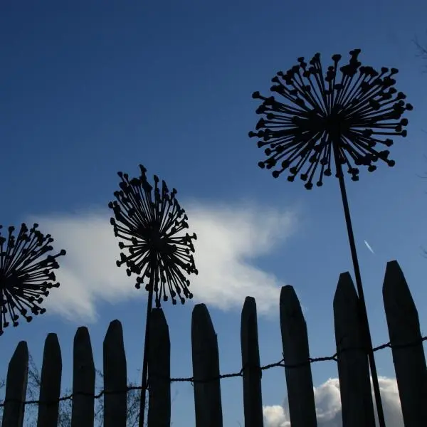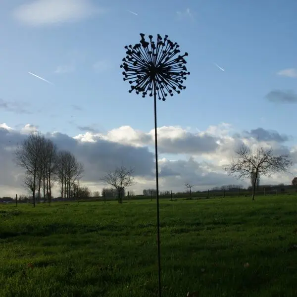 Deze mooie allium is een weergave van zo’n uitgebloeide zaaddoos, vervaardigd in speciaal gevormd en behandeld metaal met een roestige look. De unieke bloem blijft altijd even mooi en staat prachtig in de border of in een plantenbak op het terras. Met de bijgeleverde stang kan je de (platte) bloem eenvoudig in de grond prikken.