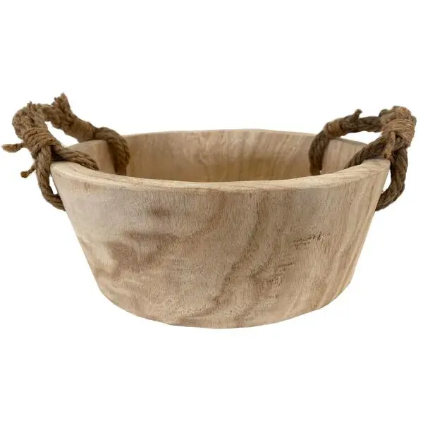 De bowl ziet er met zijn dikke randen stoer uit, de groeilijnen in het onbehandelde hout en de ruw ogende handgrepen in jute maken de bowl tot een must have voor het interieur. Gebruik de houten kom als decoratief element op de tafel of als fruitschaal.