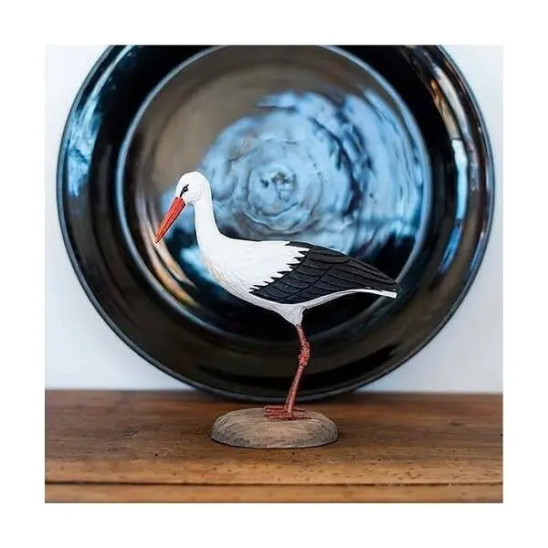 Ambachtelijk vormgegeven houten ooievaar. Deze aantrekkelijke miniatuur ooievaar is beschilderd met milieuvriendelijke verf.