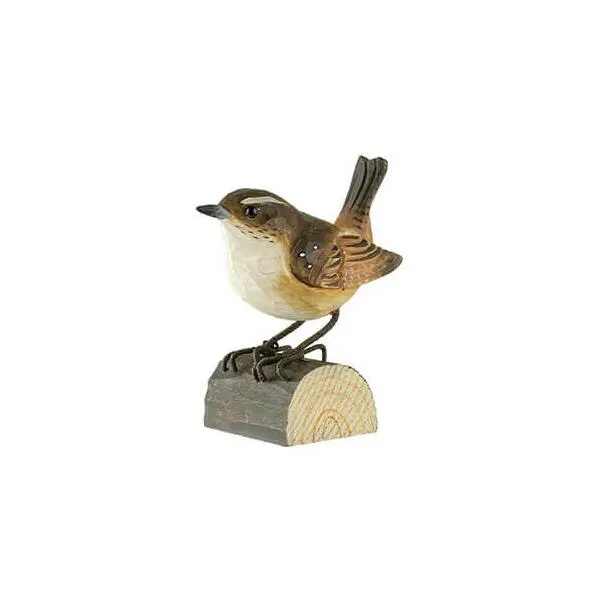 Ambachtelijk vormgegeven houten winterkoninkje. De vogel wordt op ware grootte weergegeven en is beschilderd met milieuvriendelijke verf.