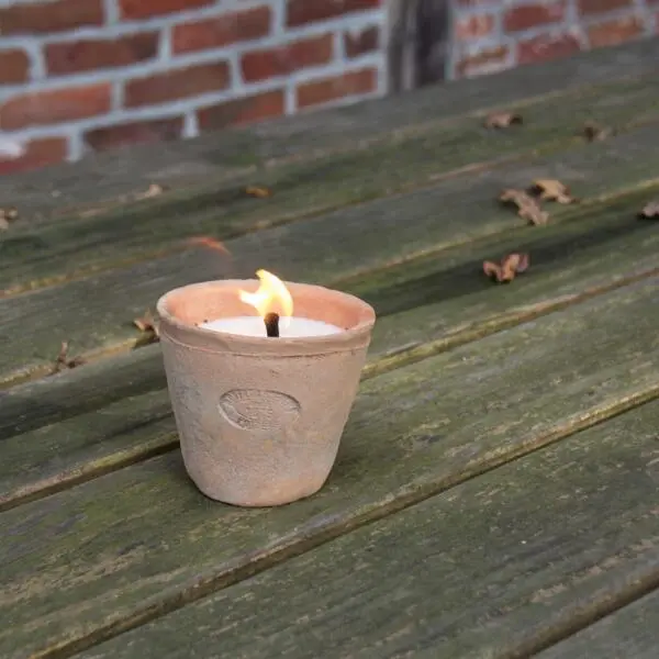 De buitenkant van deze kaars is vervaardigd uit terracotta met een verouderde look. Zo lijkt het alsof de tuinkaars al jaren in jouw tuin staat. Deze decoratieve tuinkaars zal dankzij de speciale wiek niet doven bij een beetje wind of regen. Met een brandduur van 20 uur is het de ideale sfeerbrenger op een tuinfeest.