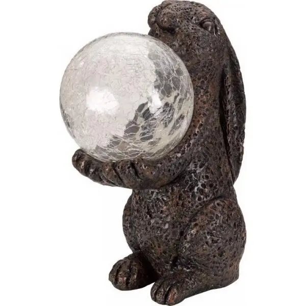 Deze lachende haas ondersteunt een mooie lichtbol op zonne-energie. Deze tuindecoratie geeft overdag en ’s avonds een charmante sfeer aan jouw terras, patio, voordeur of in jouw plantenborder. De haas is leuk gezelschap voor groot en klein en in het duister straalt de gekrakeleerde lichtbol een feeëriek licht uit. Geen elektrische voeding of bekabeling nodig want het zonlicht wordt door het zonnepaneel opgevangen en opgeslagen in interne batterijen. Dankzij de ingebouwde lichtsensor gaat de verlichting automatisch branden zodra het donker wordt. De duur van de verlichting hangt natuurlijk af van de hoeveelheid zonlicht het beeld heeft kunnen opvangen doorheen de dag.
