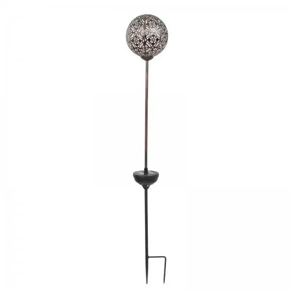 Mooie metalen tuindecoratie met een elegante solarverlichting. De meegeleverde oplaadbare batterij laadt overdag op door middel van het geïntegreerde zonnepaneeltje. Wanneer de avond valt, licht de bol automatisch op!