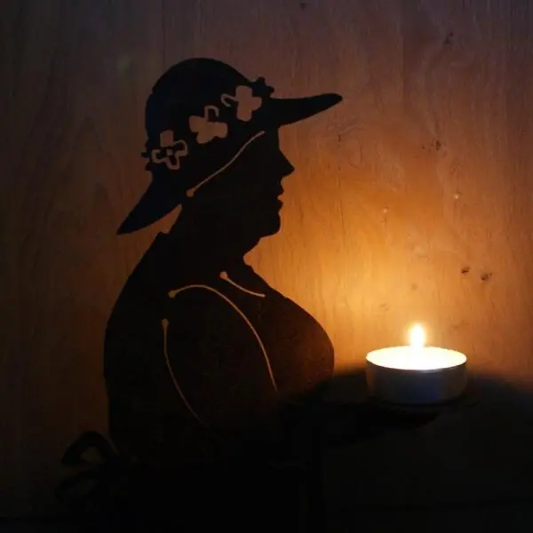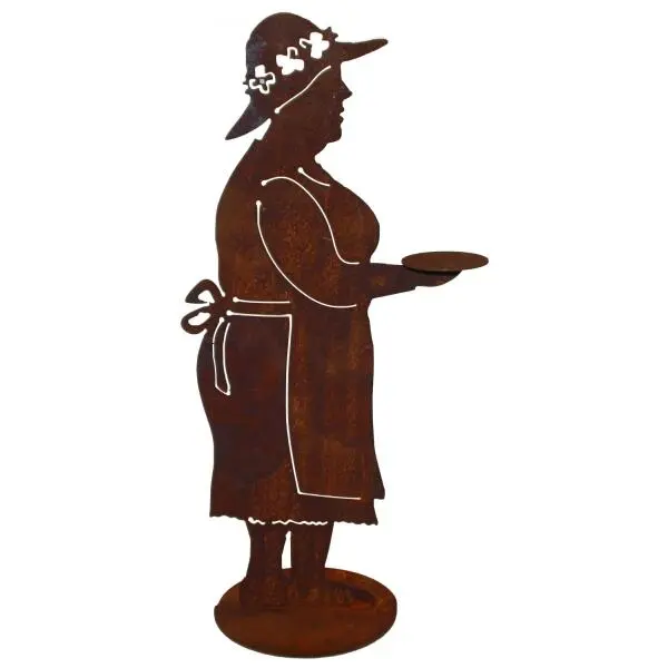 Het prachtige beeld van een marktvrouw met een draagplateau voor een bloemetje of een theelichtje, is gemaakt uit speciaal gevormd en behandeld metaal met een roestige look. Met de voorziene stevige basis kan je de marktvrouw zowel binnen als buiten een plekje geven.