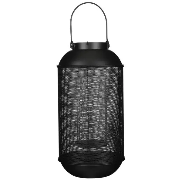 Deze metalen lantaarn is aan de binnenzijde voorzien van een transparante koker in plexiglas waarin je op een veilige manier een kaars kan plaatsen. De koker past in een metalen schaaltje die in de lantaarn hangt. Het kaarslicht schijnt doorheen de geperforeerde wand en creëert zo een uniek lichtspel op de ondergrond.