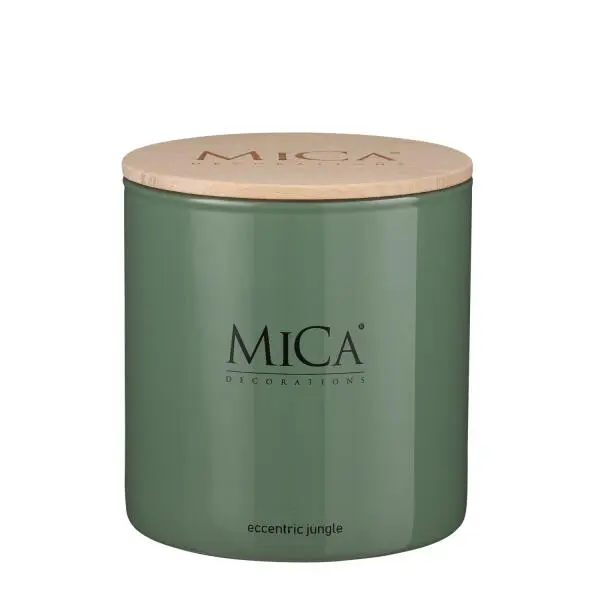 De Eccentric Jungle kaars in glas van Mica decorations heeft een luxueuze uitstraling. Ze is voorzien van een lont in berkenhout dat bij het branden een zacht knisperend geluid maakt. Een geluid die je doet denken aan een houtvuur. De kamer vult zich langzaam met een frisse en groene geur, alsof je in de natuur wandelt. Het houten deksel houdt na gebruik de aroma’s vast zodat de geur langer blijft behouden.