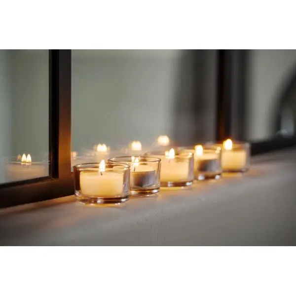 Een set geurloze theelichtjes in transparante cups. Doorheen de cups zie je de paraffine langzaam veranderen in een heldere vloeistof.
