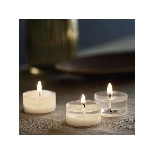Een set van twaalf grote theelichten in transparante cups. Doorheen de cups zie je de paraffine langzaam veranderen in een heldere vloeistof. Het licht schijnt doorheen de cups en zorgt voor een warme gloed in jouw interieur of op het terras.