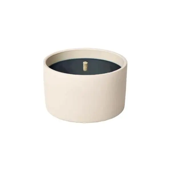 De zwarte kaars zit in een strakke, beige kleurige terracotta schaal.