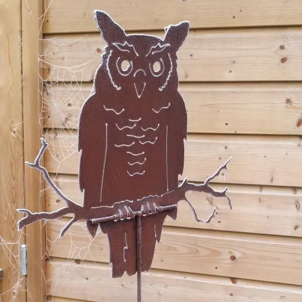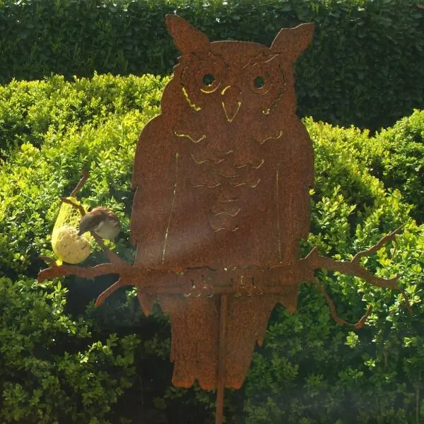 Deze prachtige oehoe is gemaakt uit speciaal gevormd en behandeld metaal met een roestige look. De uil rust op een tak en is voorzien van een stang waarmee je hem tussen de beplanting in de border kan prikken of in een plantenbak op het terras.