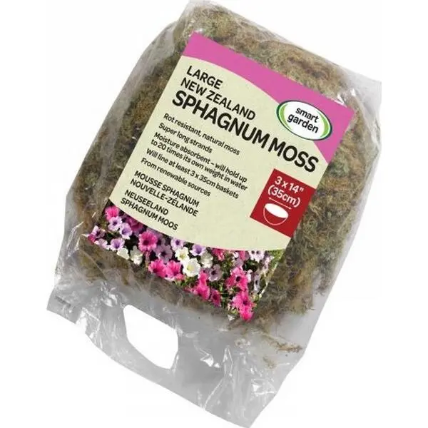 Dit natuurlijk veenmos afkomstig uit Nieuw-Zeeland kan gebruikt worden om hanging baskets op te vullen. Het heeft sterk wateropnemende eigenschappen en kan tot wel 20 maal zijn eigen gewicht in water opnemen.