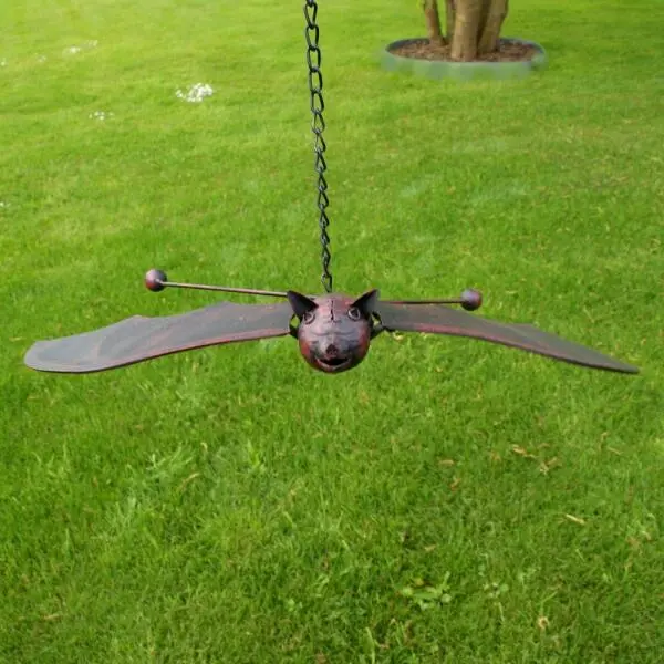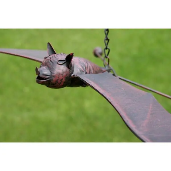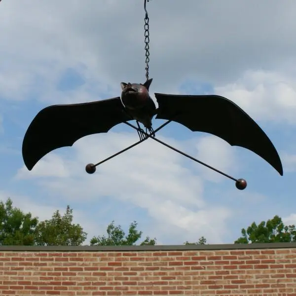 Tuindecoratie in metaal van een vleermuis met leuke snoet en brede vleugels. Hang deze vleermuis in jouw tuin aan een tak, pergola of rozenboog waar de wind langs waait. Door de wind gaan de vleugels op en neer bewegen waardoor het lijkt of de vleermuis vliegt.