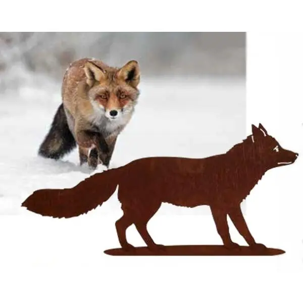 Deze mooie vos is gemaakt uit speciaal gevormd en behandeld metaal met een roestige look. Met de voorziene stevige basis kan je de vos zowel binnen als buiten een plekje geven.
