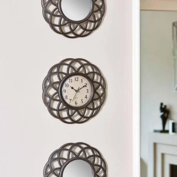 De set bestaat uit een spiegel, een wandklok en een fotoframe. De drie afzonderlijke elementen zijn met dezelfde omlijsting afgewerkt zodat ze perfect bij elkaar passen.