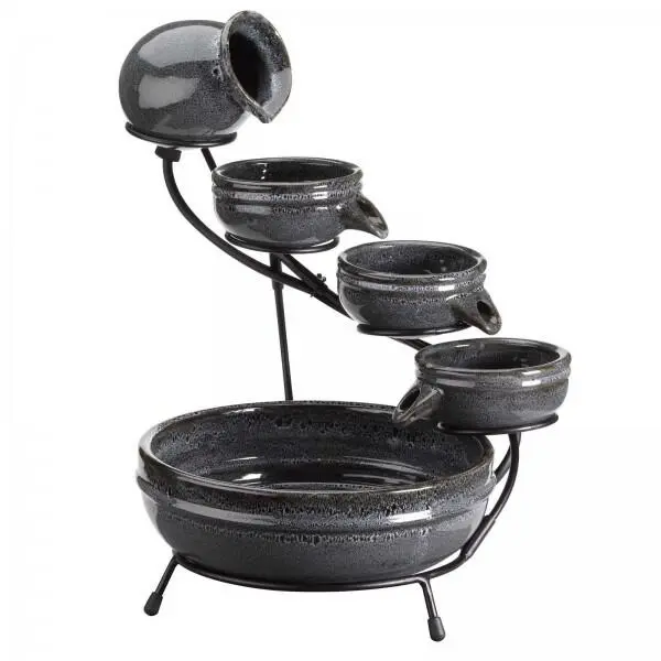 De aanwezige solarpomp zorgt ervoor dat het water circuleert op zonnige zomerdagen! Hierdoor wordt het water vanuit de grote schaal naar boven gepompt om op die manier vanuit de kan, doorheen de kleine schalen, opnieuw in de onderste schaal terecht te komen.